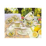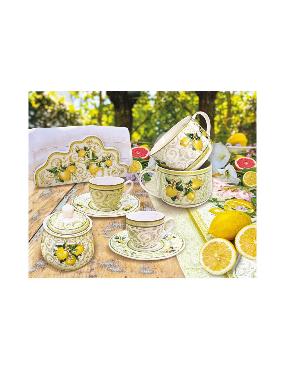Fresca,elegante,delicata:la collezione limoni riflette i paesaggi del mediterraneo,dove la natura sempreverde si accosta a fiori e frutti creando un paradiso di odori e tonalità.Decori eleganti e luminosi colori, in un set di articoli per tavola e casa pensato per rigenerare spirito e mente.