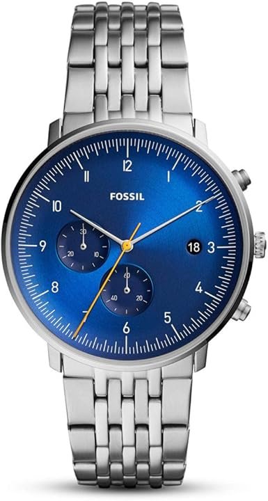 Orologio cronografo da uomo di Fossil della collezione Chase Timer. Modello con cassa rotonda del diametro di 42 mm in acciaio inossidabile di colore silver con finitura lucida e satinata e spessore di 10 mm. Orologio con vetro trasparente, quadrante di colore blu. Bracciale in acciaio inossidabile di colore silver con finitura satinata e lucida, chiusura deployante e distanza delle anse di 22 mm. Orologio con movimento al quarzo e resistenza all’acqua di 3 ATM
