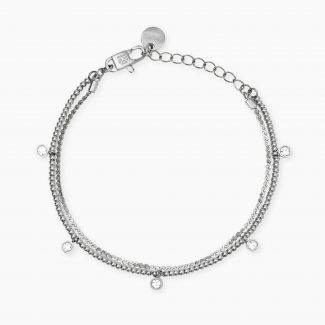 Bracciale regolabile con catene figaro e groumette diamantata in acciaio con ciondolo con cristallo.
