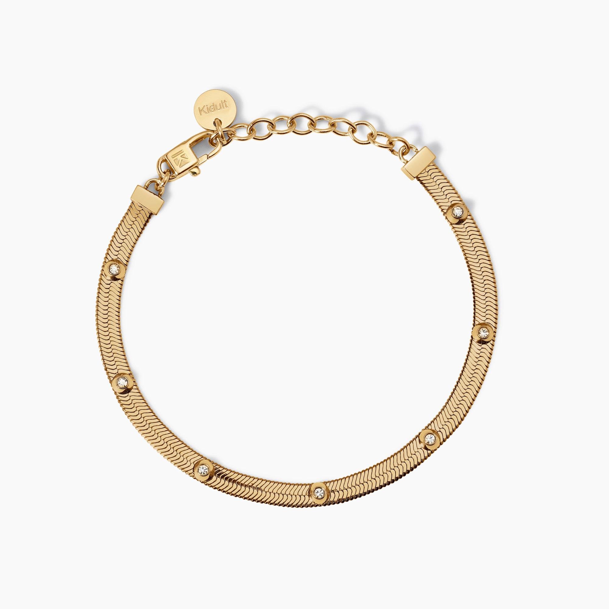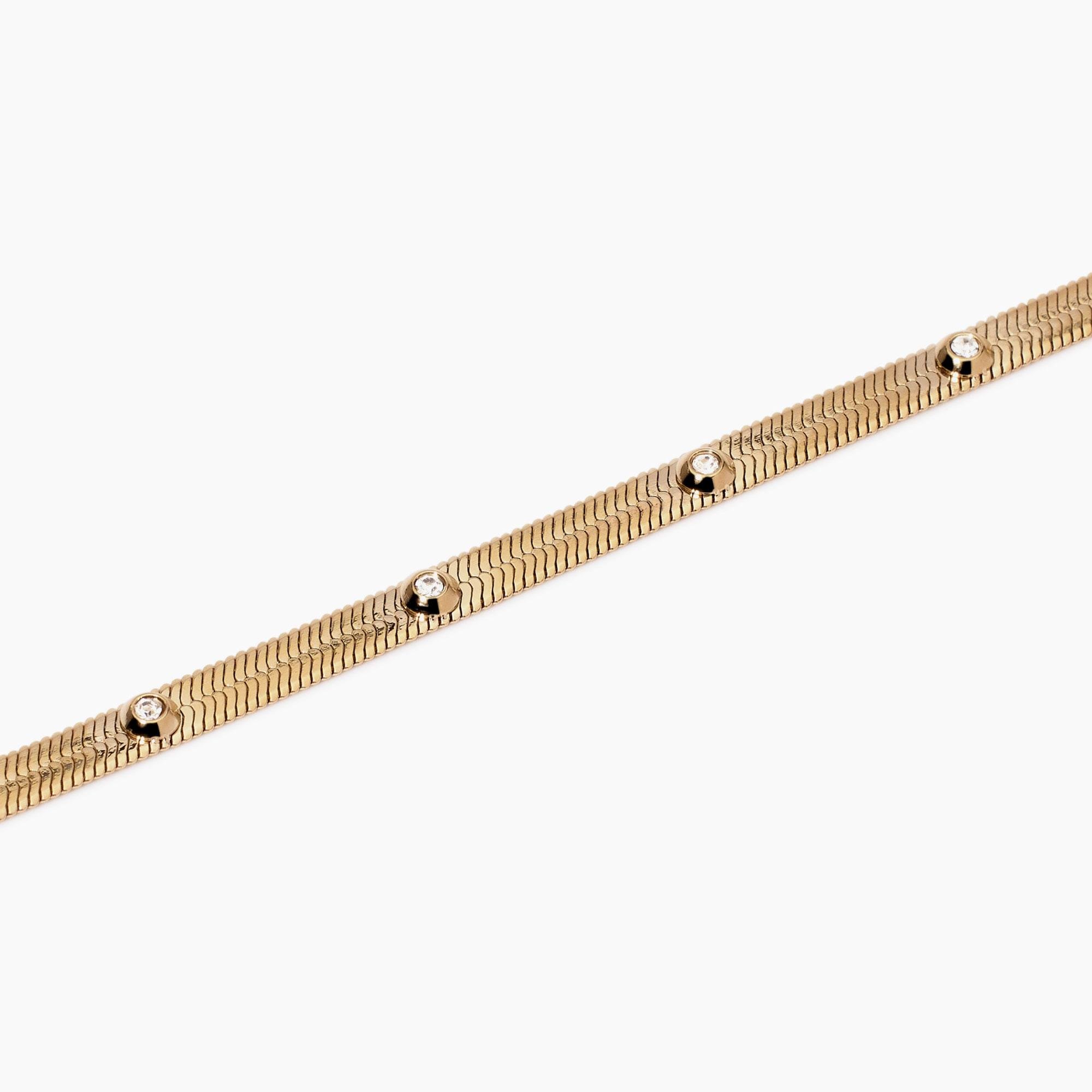 Bracciale regolabile in acciaio dorato con catena Herringbone e cristalli.