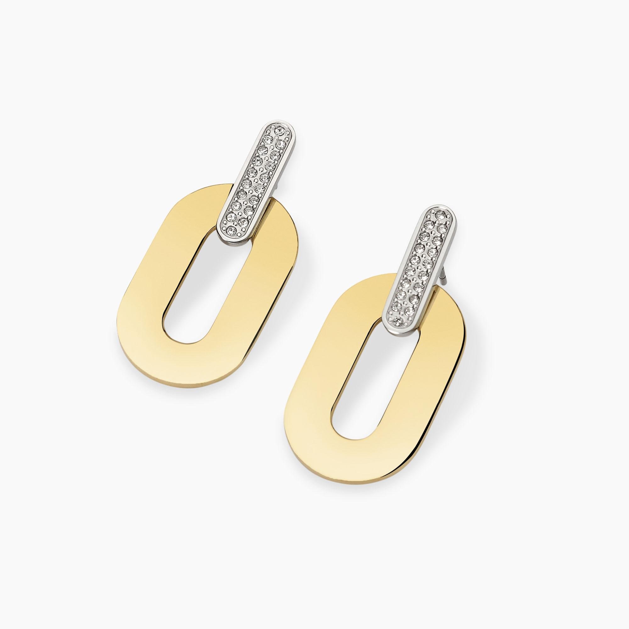 Orecchini in acciaio dorato con cristalli bianchi e pendenti allungati.