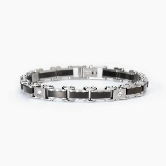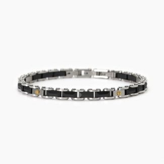 Bracciale in acciaio con sfere di ematite alternate a dischetti di acciaio, elemento centrale a forma cilindrica in acciaio con trama con black oil. Ad una estremità elemento rettangolare in acciaio con trama con black oil, sul fronte il logo Marlù, su retro la parola Namastè. Chiusura con moschettone su entrambi i lati. Estensione con catena rolò con trama, removibile e/o regolabile tramite moschettone tondo al centro. Materiali: acciaio, ematite, black oil