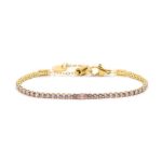 Bracciale con catena tennis con cubic zirconia 2,50 mm, con al centro un cubic zirconia taglio baguette. Lunghezza totale 19 cm regolabile tramite cursore da 19 cm a 15 cm. Chiusura a moschettone. Marlù logo tag presente all’ estremità.