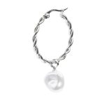 Mono orecchino in acciaio a cerchio ritorto con diametro 2,7 cm, con perla irregolare bianca rivestita pendente. Marlù logo laserato sulla chiusura. Lunghezza totale 4,2 cm. Disponibile in acciaio e acciaio con pvd oro.