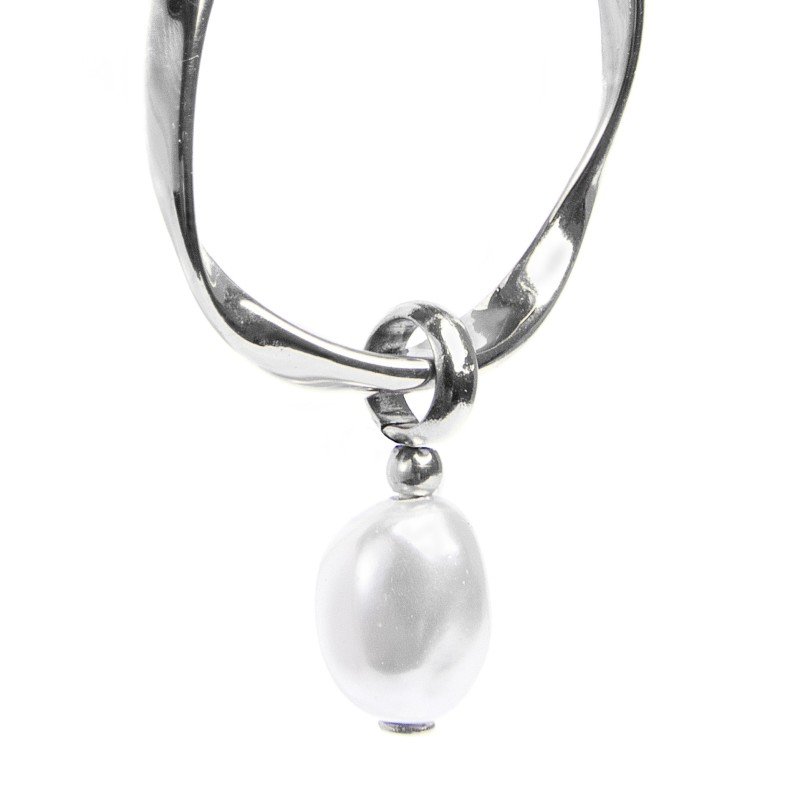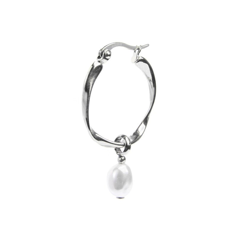 Mono orecchino in acciaio a cerchio irregolare con diametro 2,2 cm, con perla ovale bianca rivestita pendente. Marlù logo laserato sulla chiusura. Lunghezza totale 3,5 cm. Disponibile in acciaio e acciaio con pvd oro.