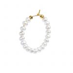 Mono orecchino a cerchio in acciaio con diametro 2,8 cm con perle bianche irregolari rivestite, all’estremità due sferette di acciaio, su una delle quali è presente il logo Marlù. Disponibile in acciaio e acciaio con pvd oro.