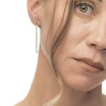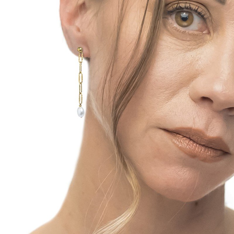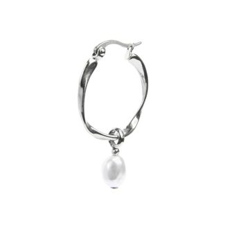 Mono orecchino in acciaio con orecchino a sfera con pendente removibile composto da catena figaro con trama con all’estremità una perla bianca irregolare rivestita. Lunghezza totale 5,2 cm. Disponibile in acciaio e acciaio con pvd oro.
