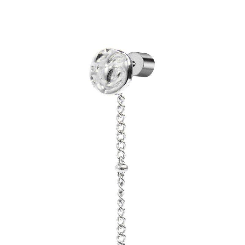 Mono orecchino in acciaio con orecchino a bottone martellato con pendente removibile composto da catena grumetta con sfere con perla bianca irregolare rivestita. Lunghezza totale 5,8 cm. Disponibile in acciaio e acciaio con pvd oro.