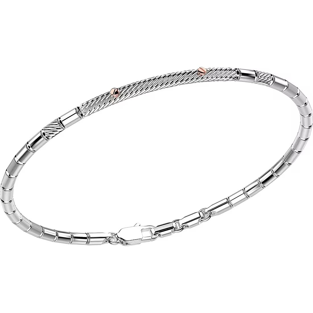Gioiello in argento 925. Bracciale costituito da bracciale semirigido, 9. 00gr di argento 925, 0. 01gr d’oro 18kt. Gioiello con dettagli di colore bianco. Gioiello di misura standard 21cm. La chiusura è a moschettone. La referenza è exb615